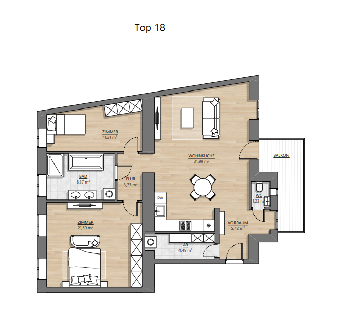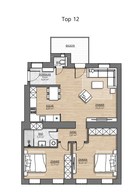 Der überwiegende Teil der Wohnungen besteht aus modernen 2 bis 3 Zimmerwohnungen. Die Größe der Wohnungen in Verbindung mit erstklassiger Ausstattung sowie der sehr guten Lage macht das Projekt aber auch attraktiv für Anleger, die auf der Suche nach einer soliden Vorsorgewohnung sind.